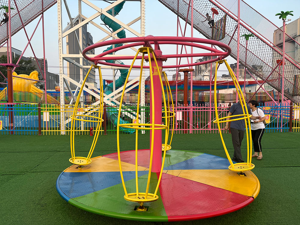 我公司生產(chǎn)的旋轉(zhuǎn)太空人是一款小成本趣味性強(qiáng)的無動(dòng)力游樂設(shè)施,直徑3米,裝備4個(gè)太空艙,游客進(jìn)去就能體驗(yàn)失重離心的感覺,還有彈簧板,攀巖繩等設(shè)施,推動(dòng)底盤就能自動(dòng)旋轉(zhuǎn),大人小孩都能玩。