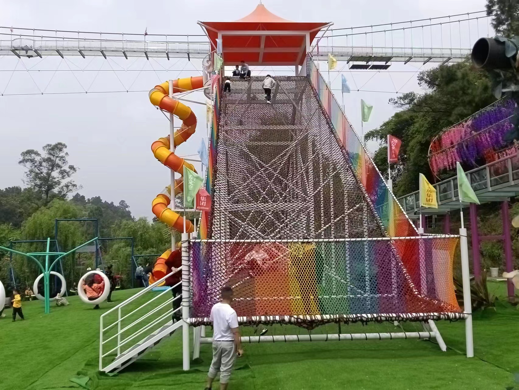 勇攀高峰是樂(lè)園的標(biāo)志性設(shè)備,由攀爬網(wǎng)和和滑滑梯組成,中間安裝玻璃站臺(tái),可以根據(jù)預(yù)算選擇高度和寬度,還可以和玻璃棧道結(jié)合做成樂(lè)園的地標(biāo)性游樂(lè)項(xiàng)目。是大型親子游樂(lè)園的必備項(xiàng)目。