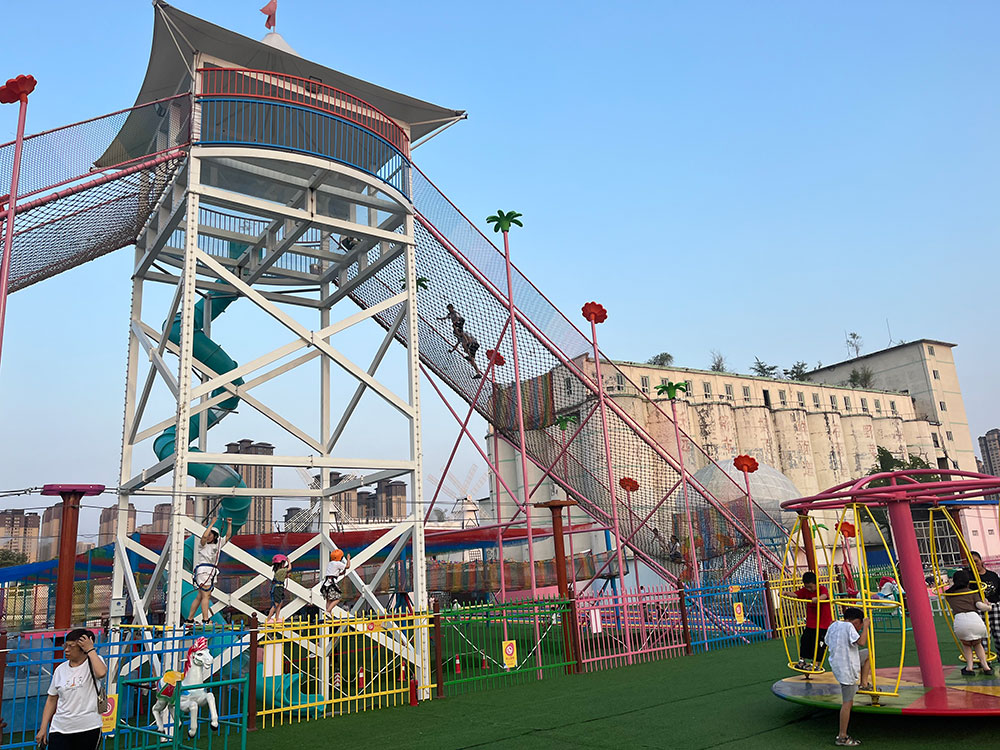 勇攀高峰是樂園的標志性設備,由攀爬網(wǎng)和和滑滑梯組成,中間安裝玻璃站臺,可以根據(jù)預算選擇高度和寬度,還可以和玻璃棧道結(jié)合做成樂園的地標性游樂項目。是大型親子游樂園的必備項目。